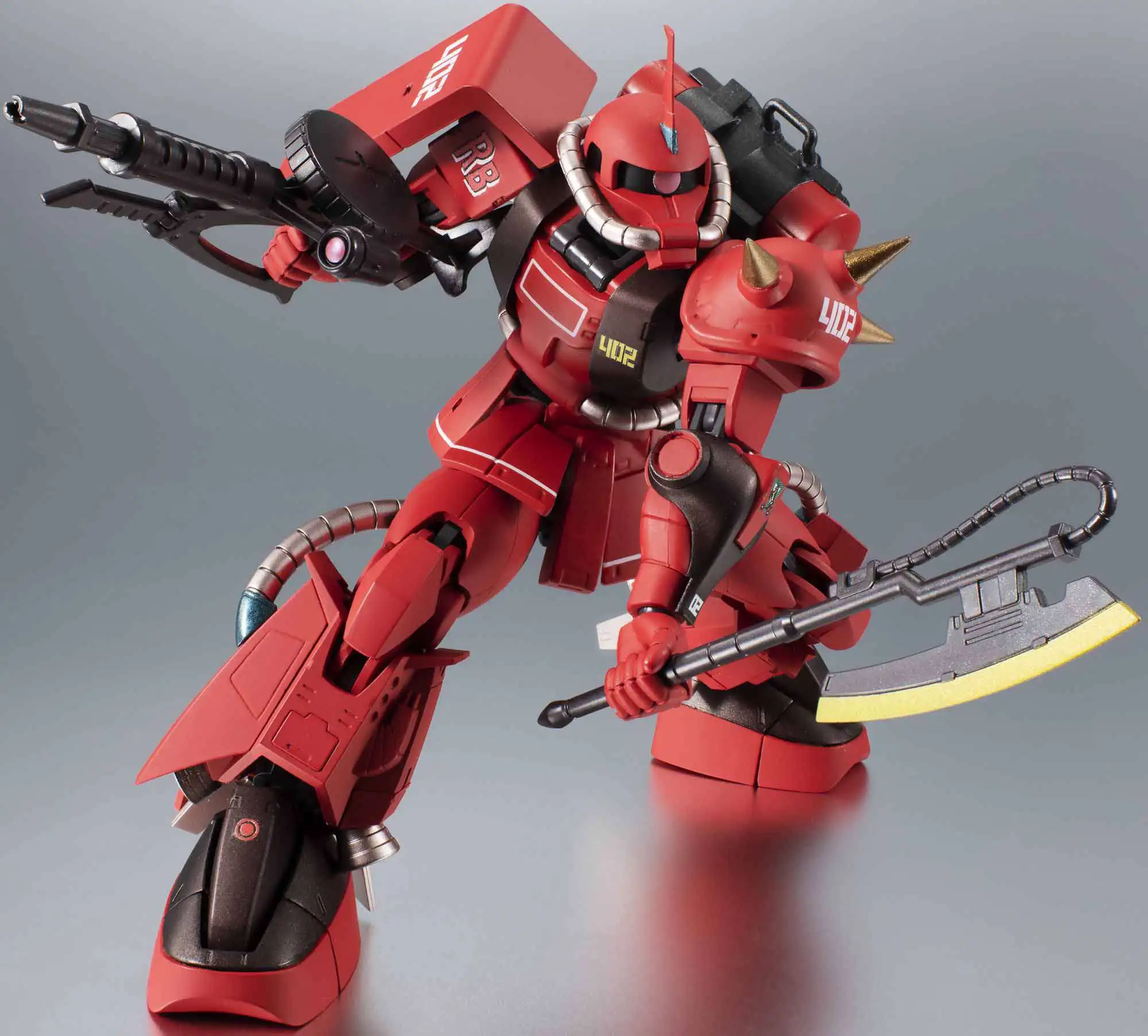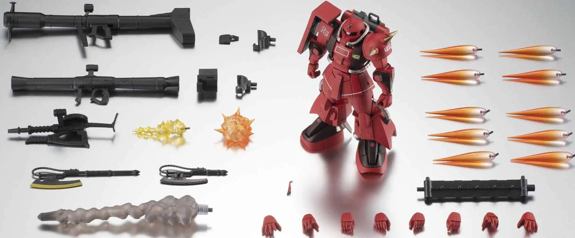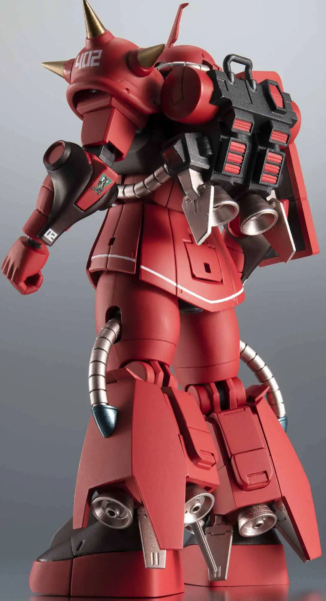 The enhanced, high-mobility Zaku II piloted by Johnny Ridden, the legendary Crimson Lightning of the MSV (Mobile Suit Variation) series, joins ver.A.N.I.M.E.! A next-generation evolution of the standard MS-06R-1 Zaku capable of handling what was then state of the art beam weaponry, it is one of a handful of prototypes produced for the ace pilots of the Zeon. Johnny Ridden’s is decked out in his personal red and black color scheme, designed to strike terror into his opponents in battle. The set includes a Zaku bazooka, a giant bazooka, a Zaku machinegun, Heat Hawk axe, Heat Hawk axe (stowed), six curved Vernier thruster effects, four straight Vernier thruster effects, Zaku bazooka effect part, Zaku machinegun effect part, explosion effect, four pairs of optional hands (L/R), hand storage deck, and a set of connector joints.
